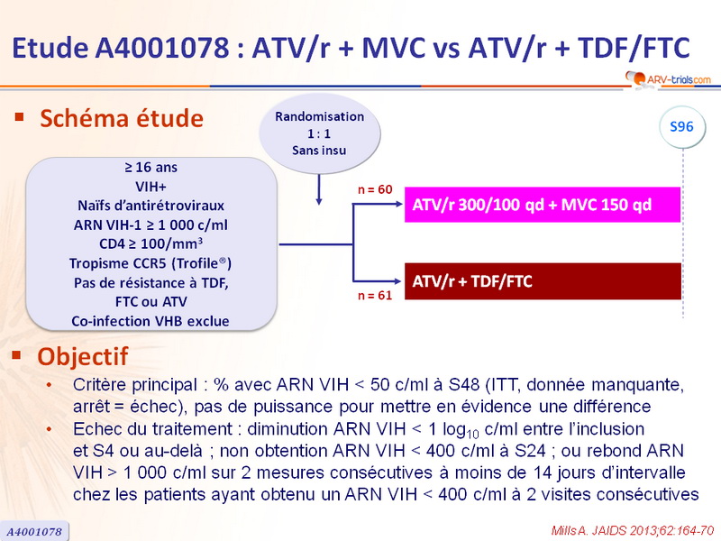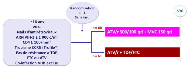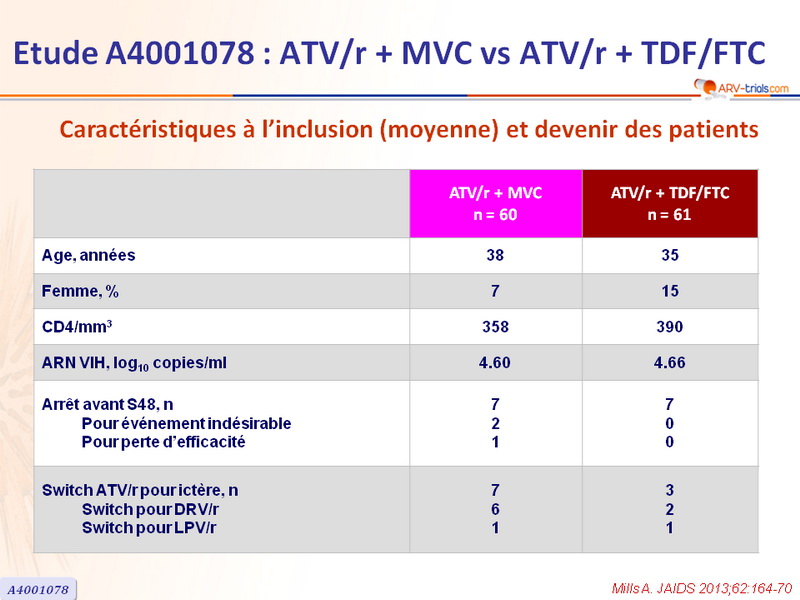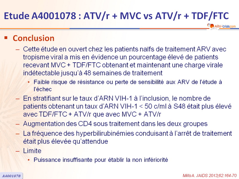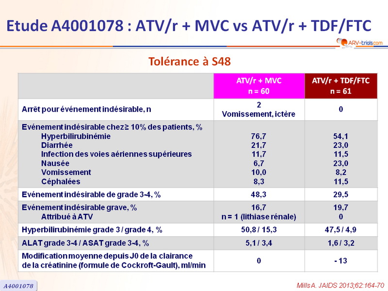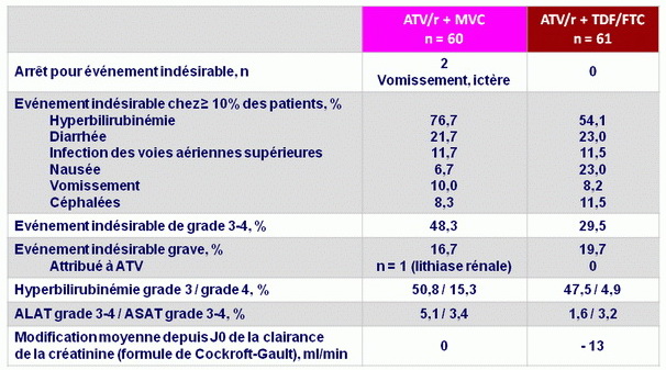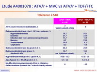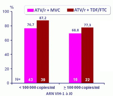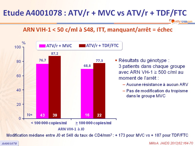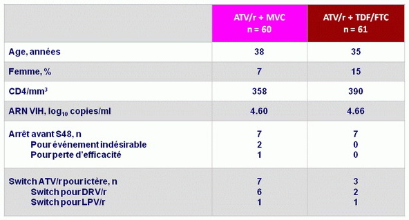 Modification médiane entre J0 et S48 du taux de CD4/mm3 : + 173 pour MVC vs + 187 pour TDF/FTC
