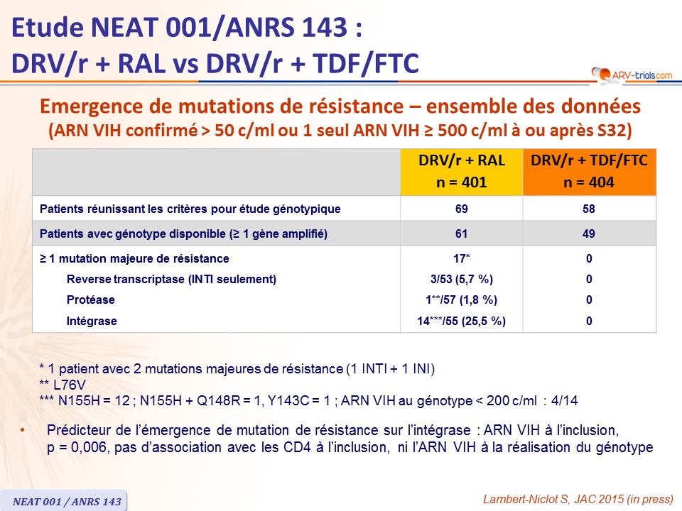 - Prédicteur de l'émergence de mutation de résistance sur l'intégrase : ARN VIH à l'inclusion , p=0,006, pas d'association avec les CD4 à l'inclusion , ni l'ARN VIH à la réalisation du génotype