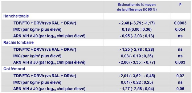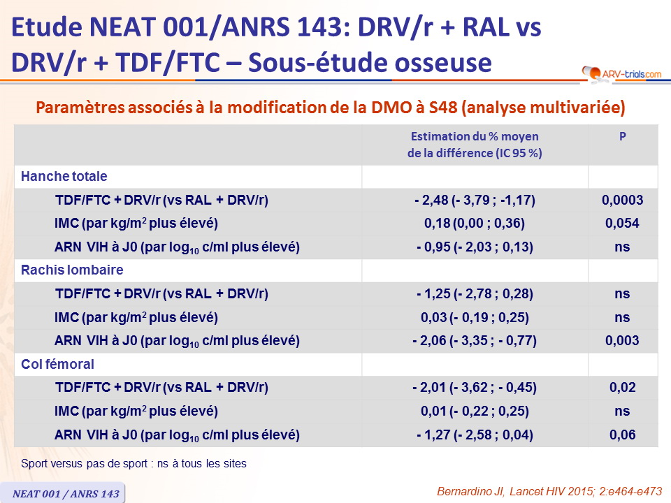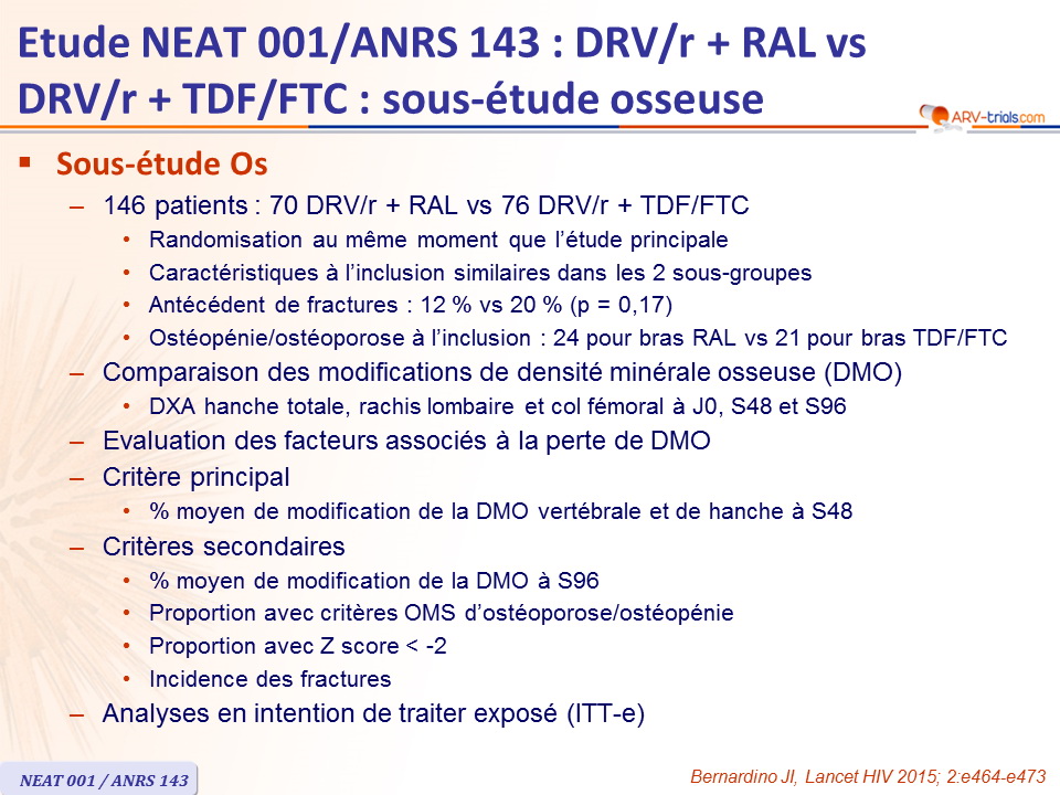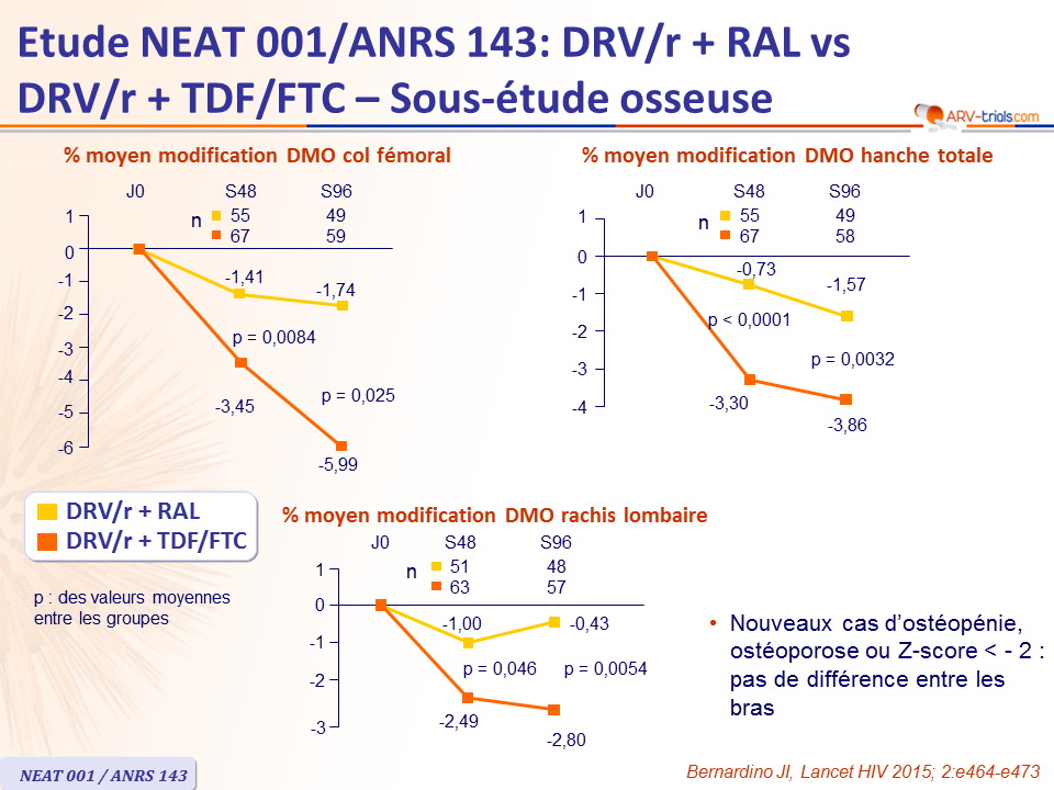 - Ostéopénie/ostéoporose à l'inclusion : 24 pour bras RAL vs 21 pour bras TDF/FTC