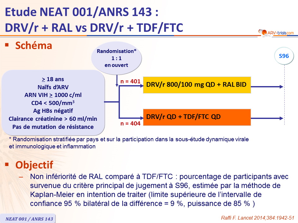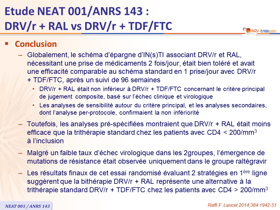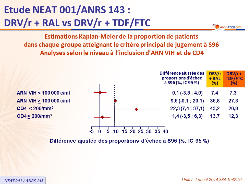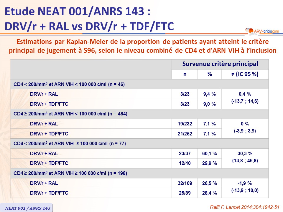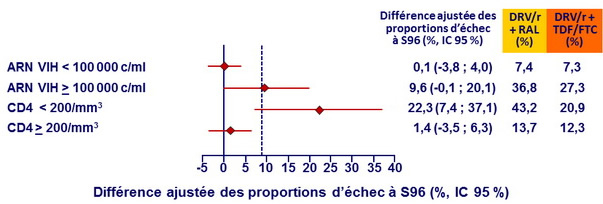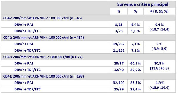 - Toutefois, les analyses pré-spécifiées montraient que DRV/r + RAL était moins efficace que la trithérapie standard chez les patients avec CD4 < 200/mm3