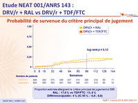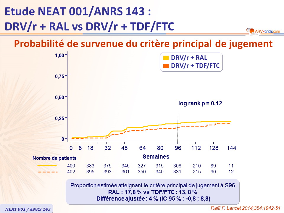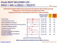 - Non infériorité de RAL comparé à TDF/FTC : pourcentage de participants avec survenue du critère principal de jugement à S96, estimée par la méthode de Kaplan-Meier en intention de traiter (limite supérieure de l'intervalle de confiance 95 % bilatéral de la différence = 9 %, puissance de 85 %)