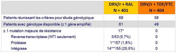- Malgré un faible taux d'échec virologique dans les 2 groupes, l'émergence de mutations de résistance était observée uniquement dans le groupe raltégravir