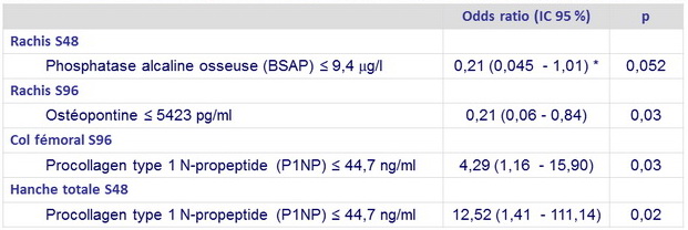 - Les taux à J0 de phosphatase alcaline osseuse, de P1NP et d' ostéopontine étaient associés à une diminution de DMO > 5 % à S96