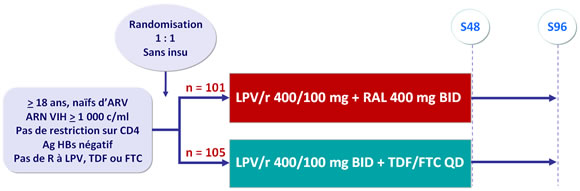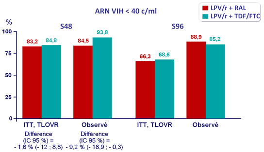 - Non infériorité de LPV/r + RAL à S48 : % ARN VIH < 40 c/ml en intention de traiter, analyse TLOVR (borne inférieure de l’IC 95 % de la différence = -20 %, puissance 90 %)