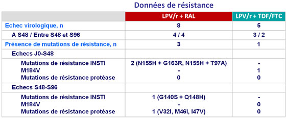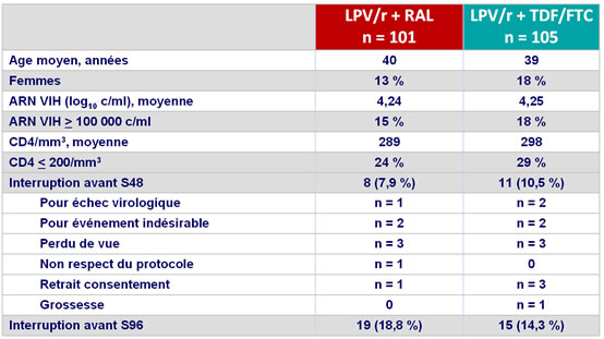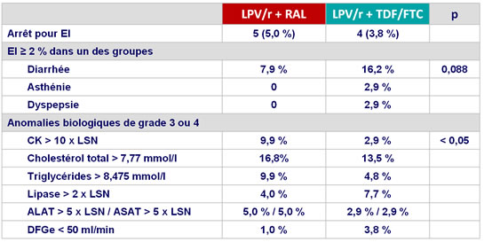 - A 96 semaines, LPV/r + RAL avait une efficacité, tolérance et toxicité similaires à la trithérapie standard LPV/r + TDF/FTC