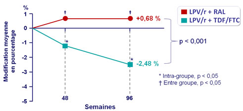 - Pas de modification de la densité minérale osseuse avec LPV/r + RAL