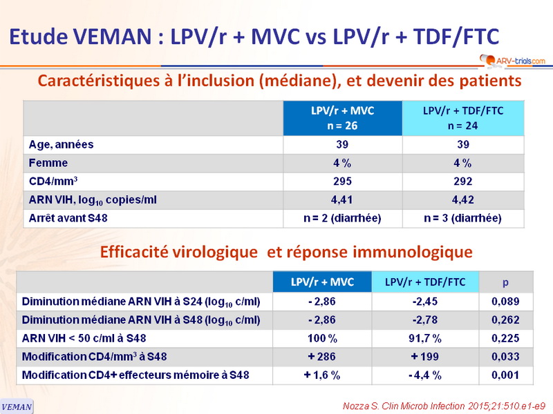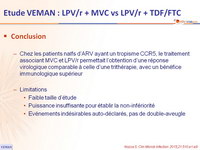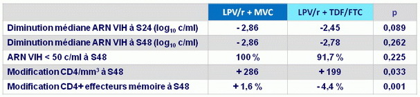- Chez les patients naïfs d’ARV ayant un tropisme CCR5, le traitement associant MVC et LPV/r permettait l’obtention d’une réponse virologique comparable à celle d’une trithérapie, avec un bénéfice immunologique supérieur