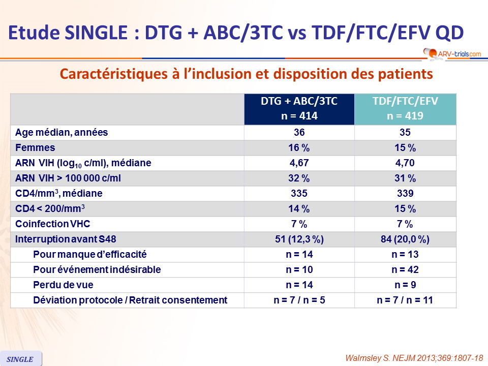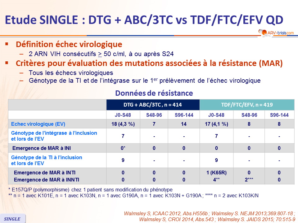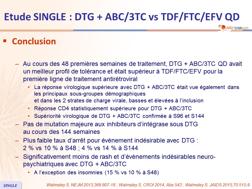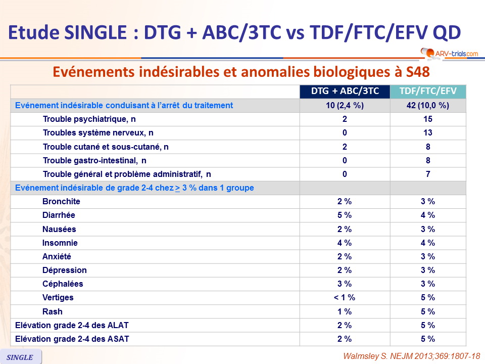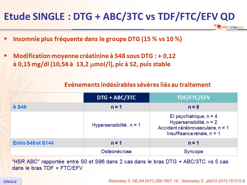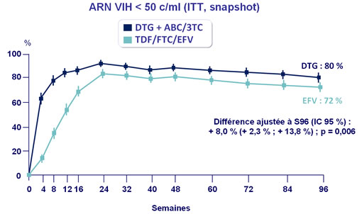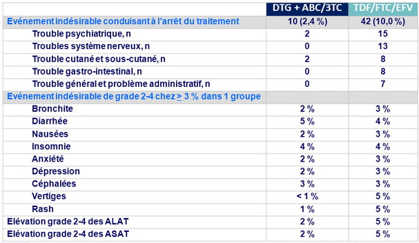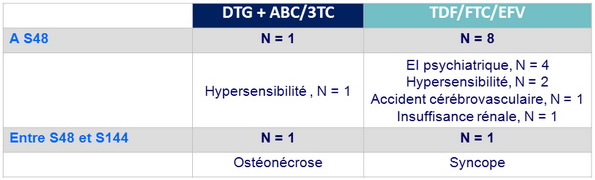 "HSR ABC" rapportée entre S0 et S96 dans 2 cas dans le bras DTG + ABC/3TC vs 5 cas dans le bras TDF + FTC/EFV