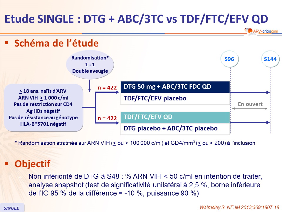 - Non infériorité de DTG à S48 : % ARN VIH < 50 c/ml en intention de traiter, analyse snapshot (test de significativité unilatéral à 2,5 %, borne inférieure de l’IC 95 % de la différence = -10 %, puissance 90 %)