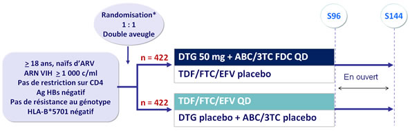 * Randomisation stratifiée sur ARN VIH (< ou > 100 000 c/ml) et CD4/mm3 (< ou > 200) à l’inclusion