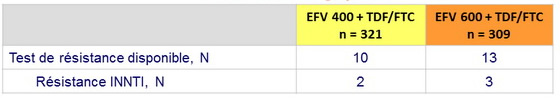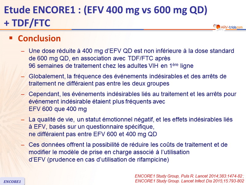 - Une dose réduite à 400 mg d’EFV QD est non inférieure à la dose standard de 600 mg QD, en association avec TDF/FTC après 48 semaines de traitement chez les adultes VIH en 1ère ligne