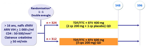 *Randomisation stratifiée sur le centre clinique et l'ARN VIH ( < ou > 100 000 c/ml) à l'inclusion