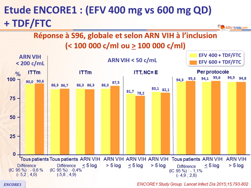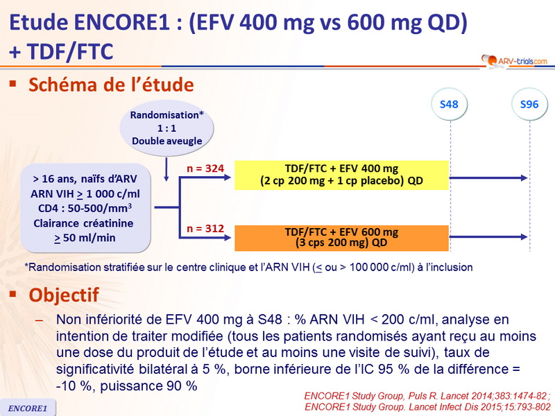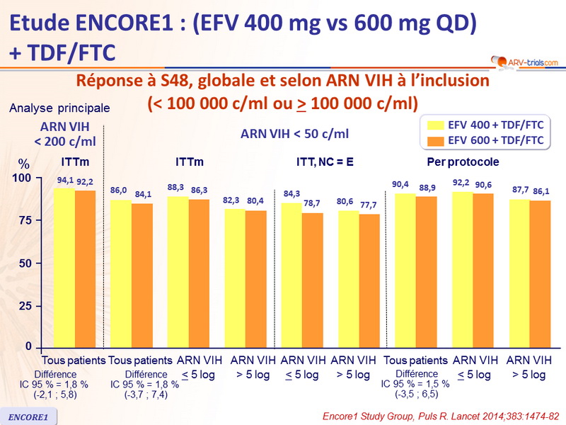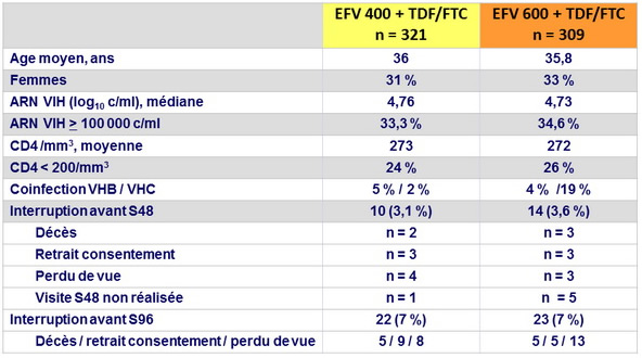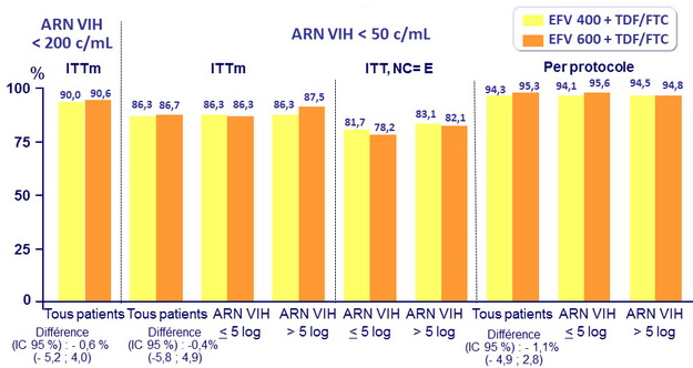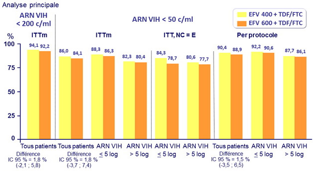 - Non infériorité de EFV 400 mg à S48 : % ARN VIH < 200 c/ml, analyse en intention de traiter modifiée (tous les patients randomisés ayant reçu au moins une dose du produit de l'étude et au moins une visite de suivi), taux de significativité bilatéral à 5 %, borne inférieure de l'IC 95 % de la différence =
