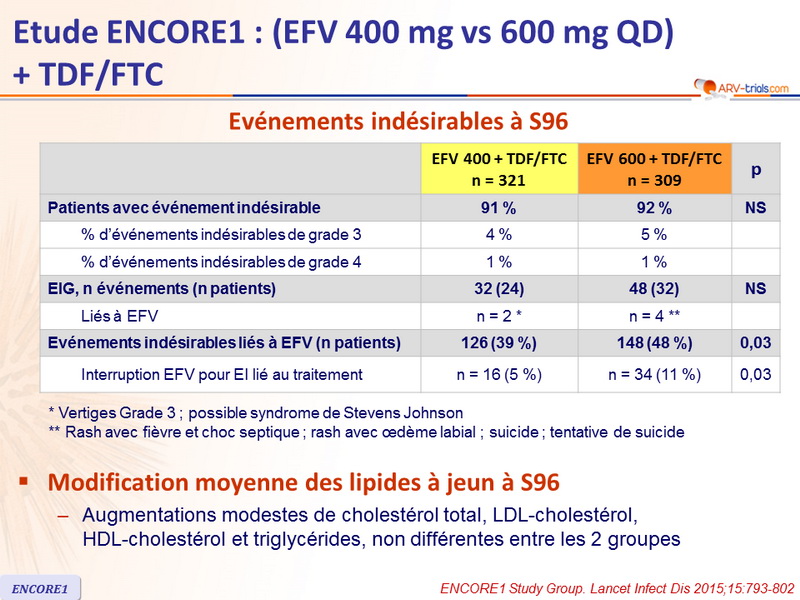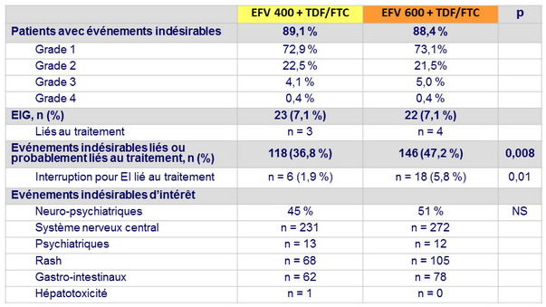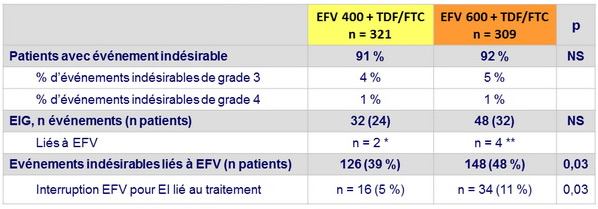 - Cependant, les événements indésirables liés au traitement et les arrêts pour événement indésirable étaient plus fréquents avec EFV 600 que 400 mg