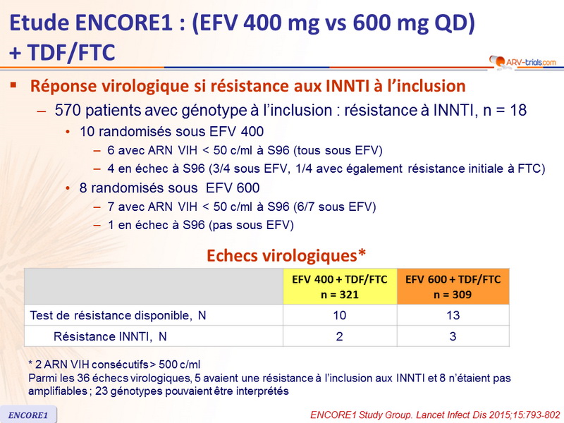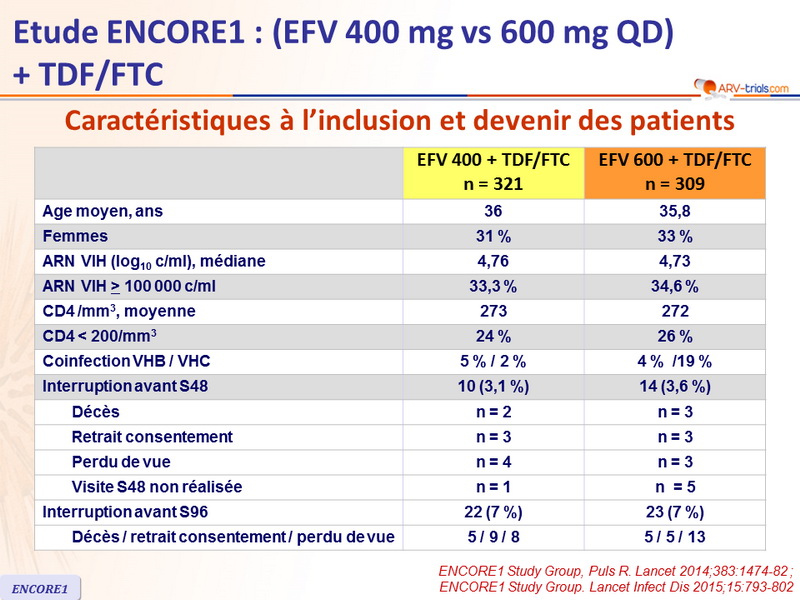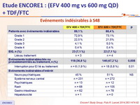 Etude ENCORE1 : (EFV 400 mg vs 600 mg QD)+ TDF/FTC