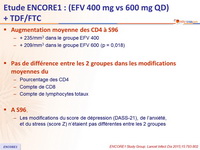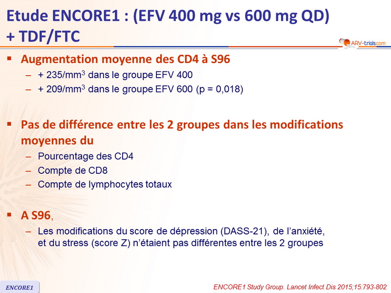 - Pas de différence entre les 2 groupes en termes de qualité de vie, dépression, anxiété et stress, et des symptômes attribués à EFV