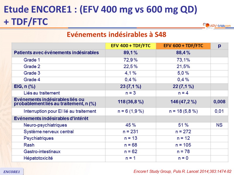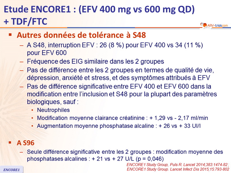 - A S48, interruption EFV : 26 (8 %) pour EFV 400 vs 34 (11 %)