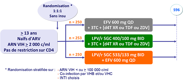 - Etude randomisée de 96 semaines comparant 3 schémas pour le traitement initial de l’infection VIH