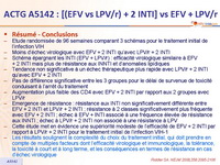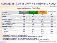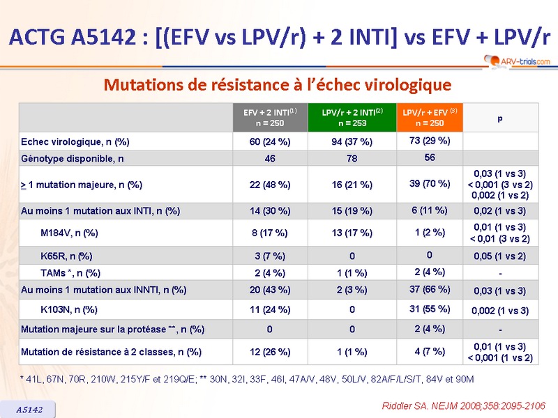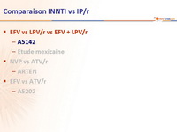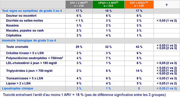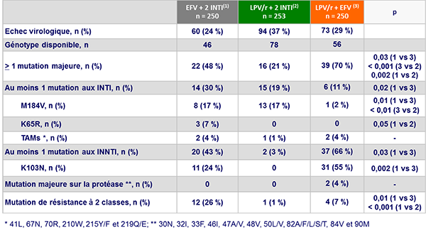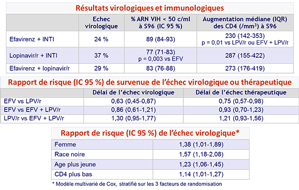 - Emergence de résistance : résistance aux INTI non significativement différente entre EFV + 2 INTI et LPV/r + 2 INTI ; résistance à 2 classes significativement plus fréquente avec EFV + 2 INTI ; échec à EFV + INTI associé à une fréquence élevée de résistance aux INNTI ; échec à LPV/r + 2 INTI non associé à une résistance à LPV