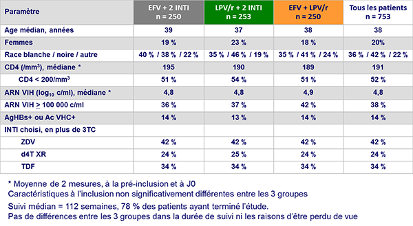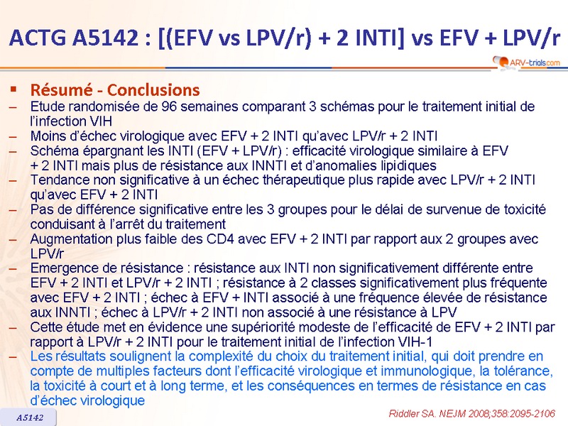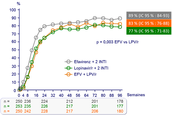 - Cette étude met en évidence une supériorité modeste de l’efficacité de EFV + 2 INTI par rapport à LPV/r + 2 INTI pour le traitement initial de l’infection VIH-1