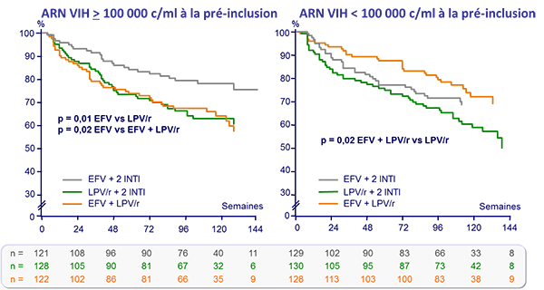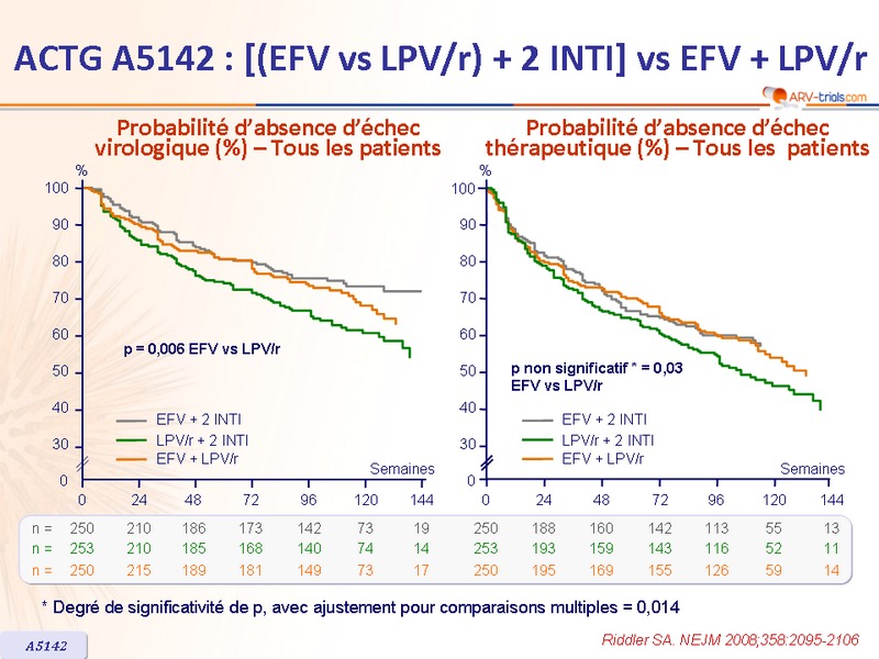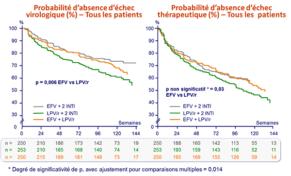 - Tendance non significative à un échec thérapeutique plus rapide avec LPV/r + 2 INTI qu’avec EFV + 2 INTI