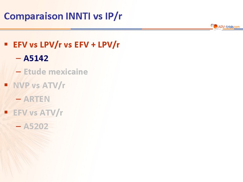 - Augmentation plus faible des CD4 avec EFV + 2 INTI par rapport aux 2 groupes avec LPV/r
