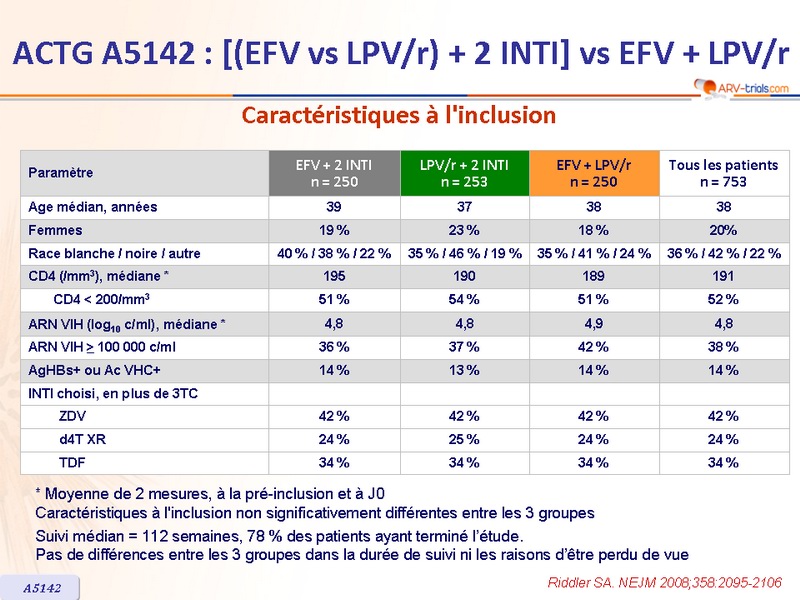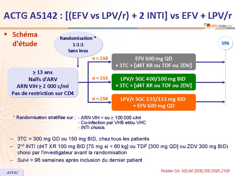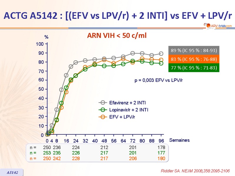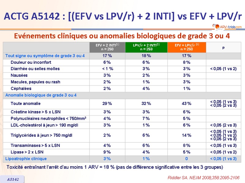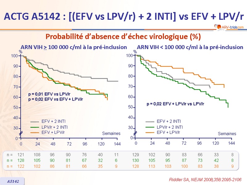 ACTG A5142 : [(EFV vs LPV/r) + 2 INTI] vs EFV + LPV/r