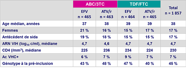 - Critères d’inclusion : infection VIH-1, > 16 ans, < 7 jours de traitement antirétroviral antérieur, résultats biologiques acceptables