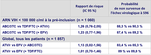- Chez les patients avec un taux d’ARN VIH < 100 000 c/ml à la pré-inclusion, le délai de survenue de l’échec virologique est similaire avec ABC/3TC et TDF/FTC, en association à ATV/r et EFV