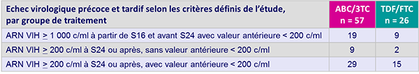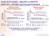 - Les patients avec ARN VIH élevé ont un risque d’échec virologique deux fois plus élevé avec ABC/3TC qu’avec TDF/FTC