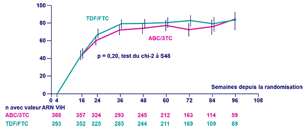 - Risque d’échec virologique ultérieur parmi les 448 patients avec > 2 valeurs consécutives d’ARN VIH < 50 c/ml = 12 dans le groupe ABC/3TC vs 9 dans le groupe TDF/FTC (p = 0,25)