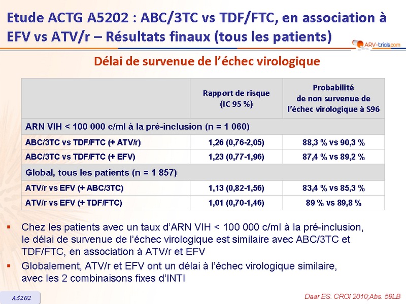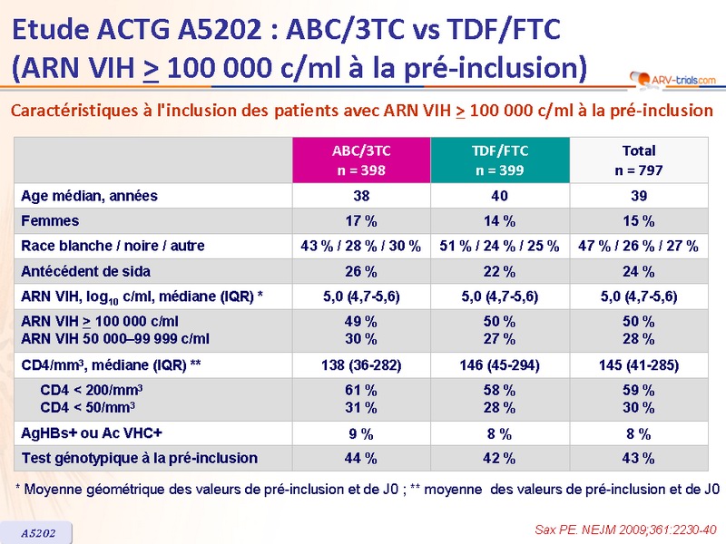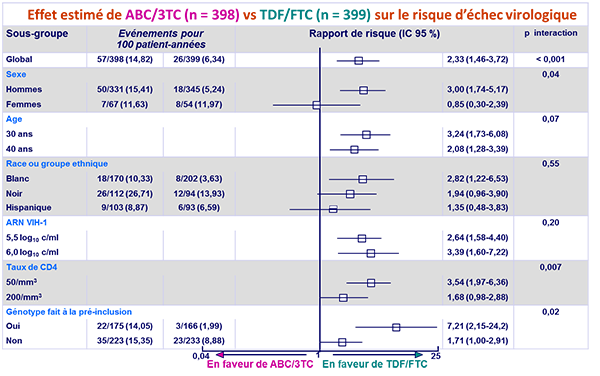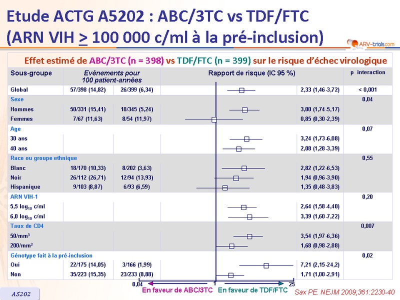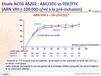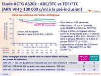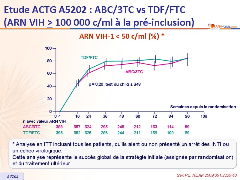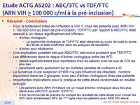 - Pour le traitement initial de l’infection à VIH-1, chez les patients avec ARN VIH > 100 000 c/ml au bilan de pré-inclusion, TDF/FTC par rapport à ABC/3TC était associé à un risque significativement inférieur