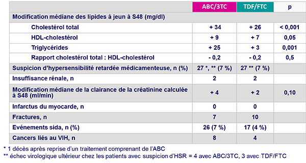 - Augmentation médiane des CD4/mm3 à S48 : 194 (ABC/3TC) vs 199 (TDF/FTC)