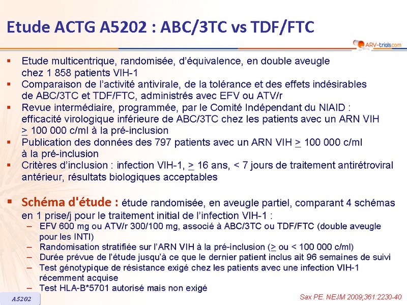 Article original : N Engl J Med. 2009 Dec 3;361(23):2230-40 - PE Sax, CROI 2010. Abs. 59LB - ES Daar