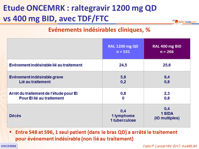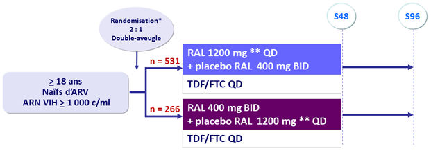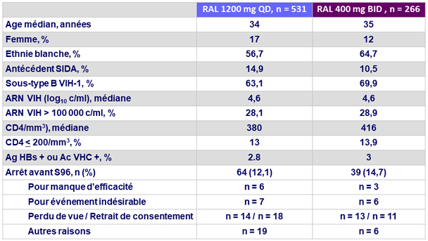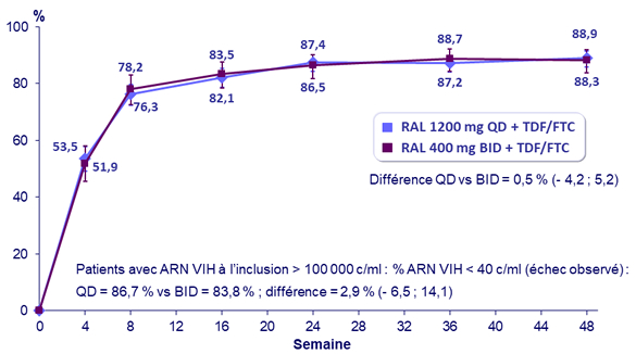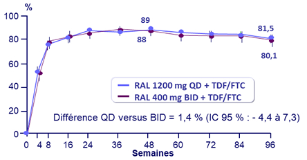 - Activité antirétrovirale statistiquement non inférieure de RAL 1200 mg QD comparativement à RAL 400 mg BID, avec 88,9 % de taux d'ARN