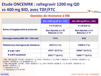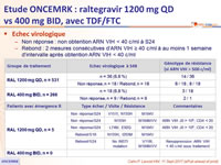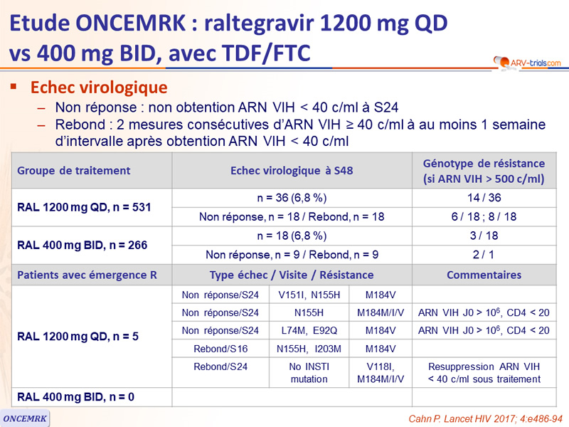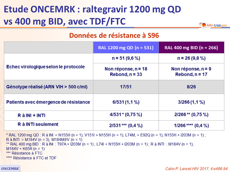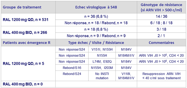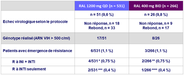 * RAL 1200 mg QD : R à INI = N155H (n = 1), V151I + N155H (n = 1), L74M, + E92Q (n = 1), N155H + I203M (n = 1) ;