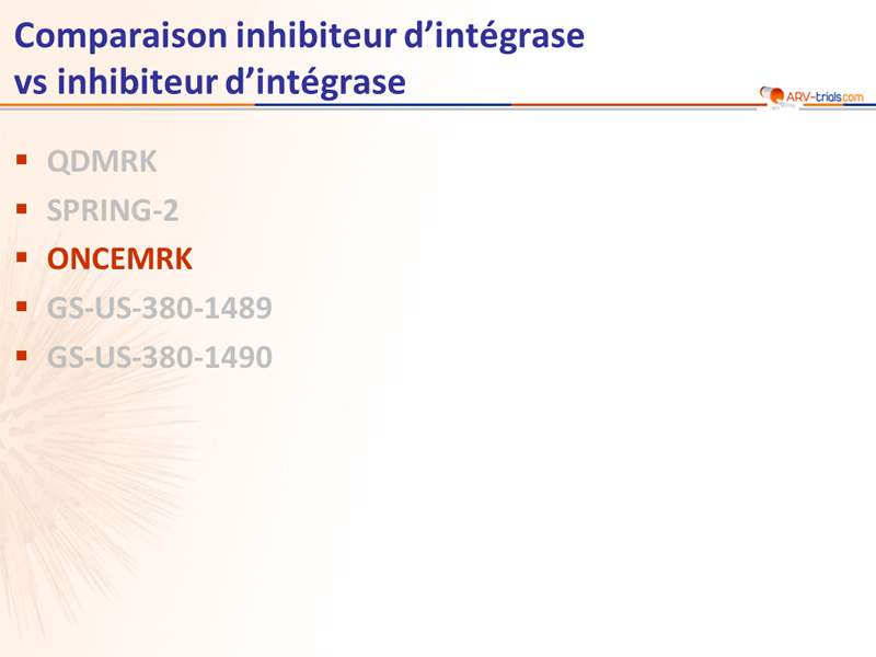 - Augmentation importante des CD4 (232/mm3) comparable à RAL 400 mg BID (234/mm3) à S48 (+ 262/mm3 à S96)