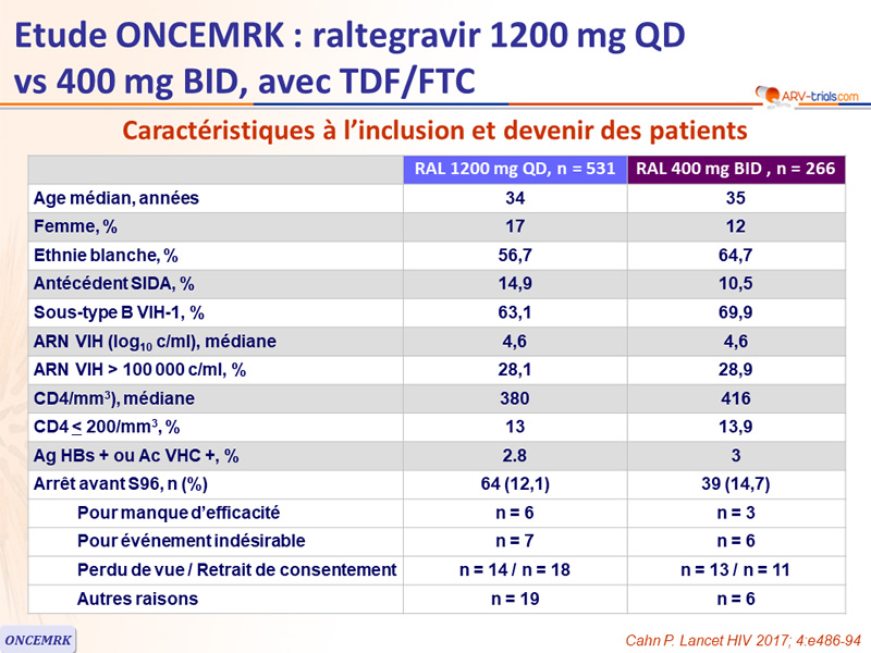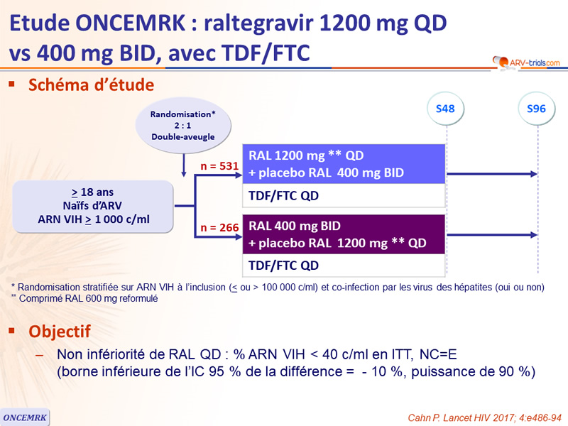 - ARN VIH inclusion > 100 000 c/ml : QD = 84,7 % vs BID = 82,9% ; ≠ 1,8 % (- 8,2 ; 13,6)