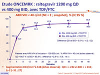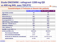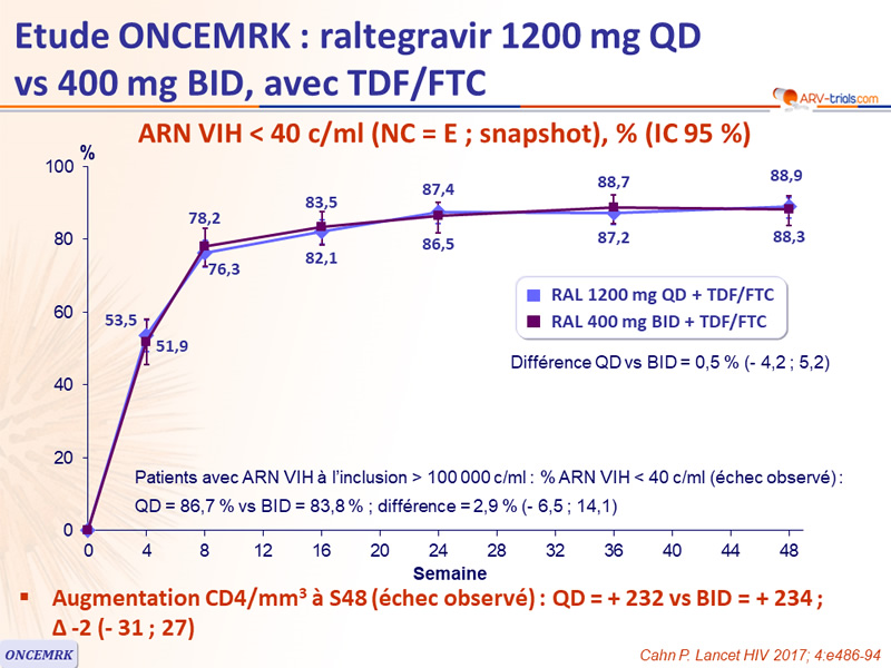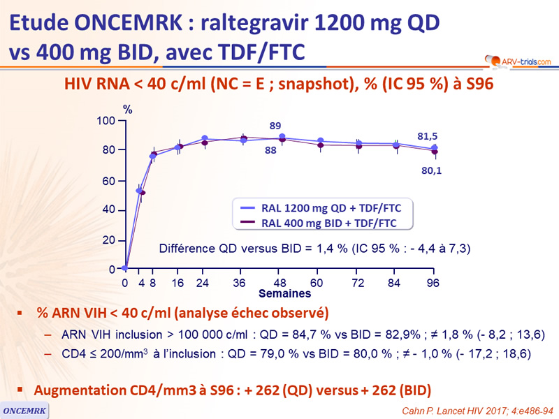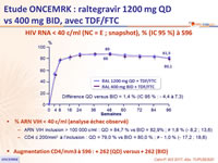 - CD4 ≤ 200/mm3 à l’inclusion : QD = 79,0 % vs BID = 80,0 % ; ≠ - 1,0 % (- 17,2 ; 18,6)