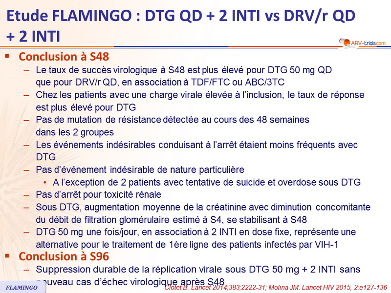 - DTG 50 mg une fois/jour, en association à 2 INTI en dose fixe, représente une alternative pour le traitement de 1ère ligne des patients infectés par VIH-1