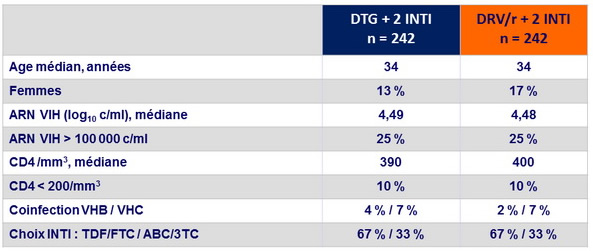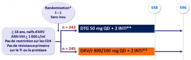 *Randomisation (DTG vs DRV/r) stratifiée sur ARN VIH (< ou > 100 000 c/ml) à l'inclusion et le choix des INTI