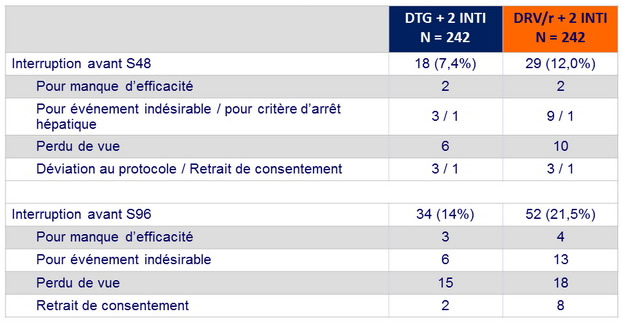 - Suppression durable de la réplication virale sous DTG 50 mg + 2 INTI sans nouveau cas d'échec virologique après S48