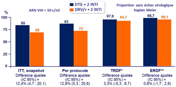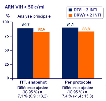 - Non infériorité de DTG à S48 : % ARN VIH < 50 c/ml en intention de traiter, analyse snapshot (test de significativité unilatéral à 2,5 %, borne inférieure