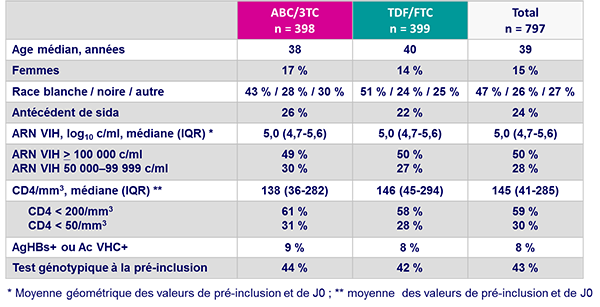 - Critères d’inclusion : infection VIH-1, > 16 ans, < 7 jours de traitement antirétroviral antérieur, résultats biologiques acceptables