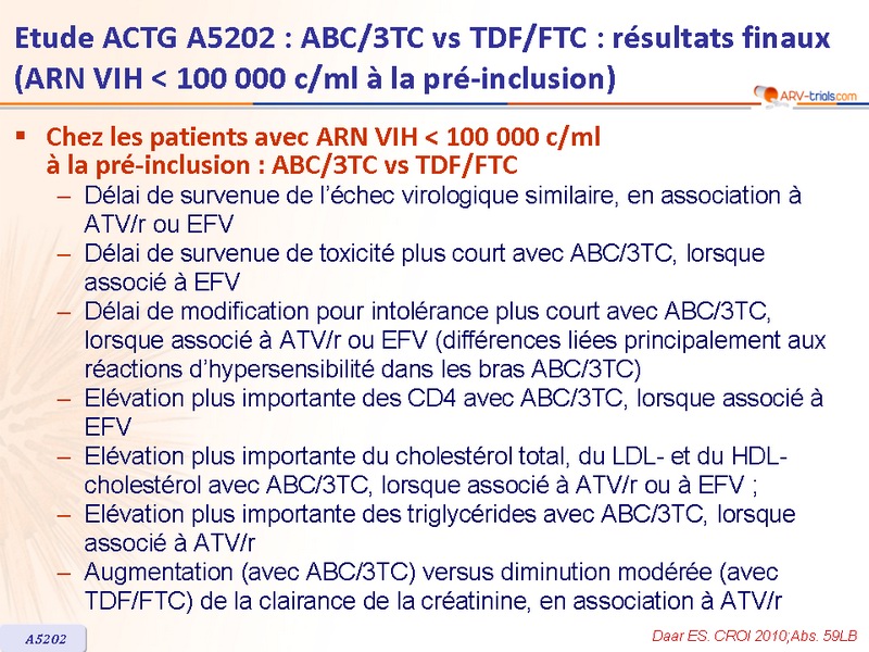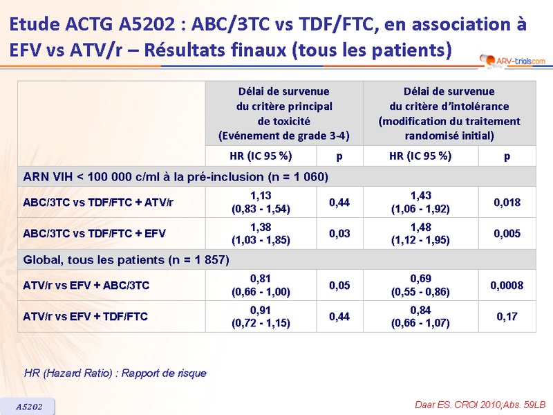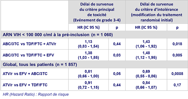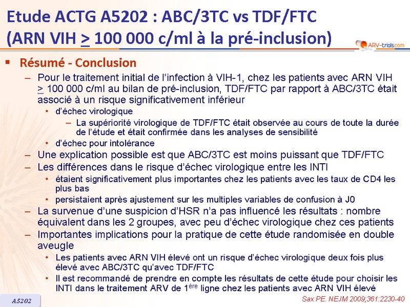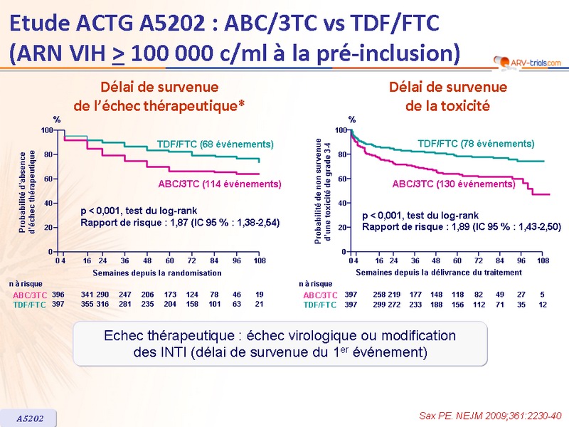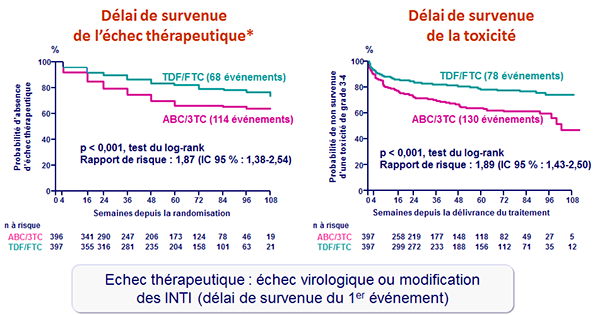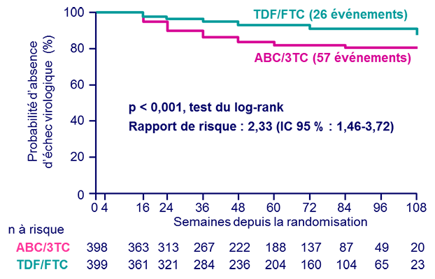 - Pour le traitement initial de l’infection à VIH-1, chez les patients avec ARN VIH > 100 000 c/ml au bilan de pré-inclusion, TDF/FTC par rapport à ABC/3TC était associé à un risque significativement inférieur