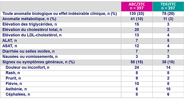 - Interruption : 10 % = 41 patientsavec ABC/3TC et 38 avec TDF/FTC