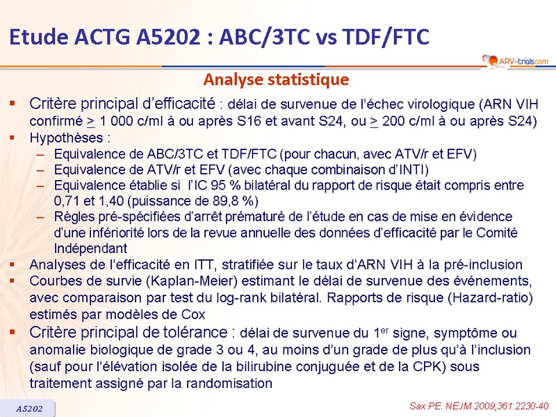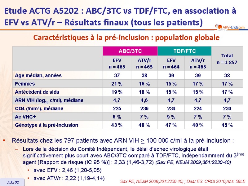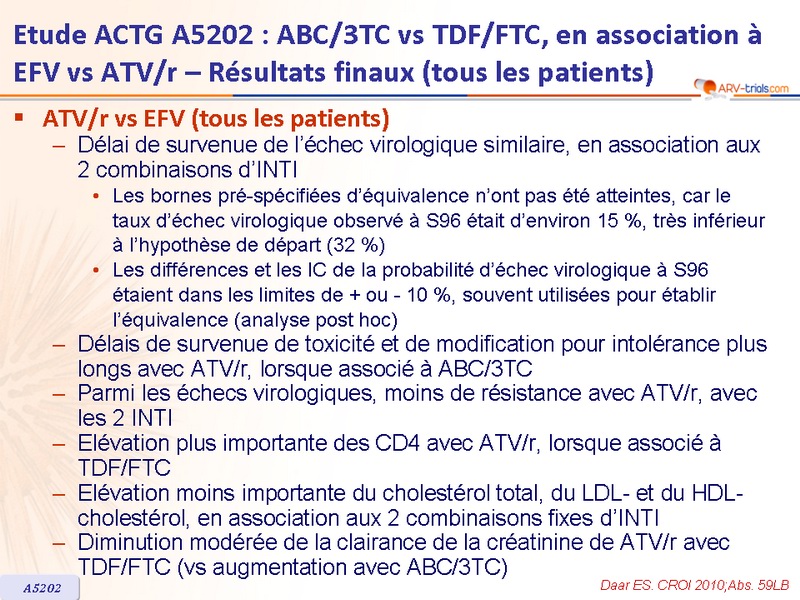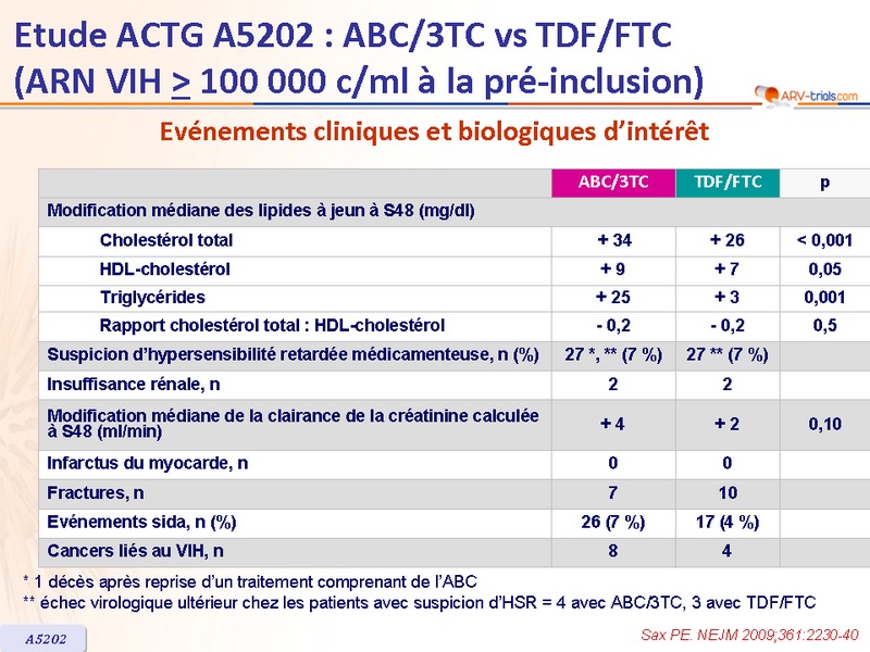 Article original : N Engl J Med. 2009 Dec 3;361(23):2230-40 - PE Sax, CROI 2010. Abs. 59LB - ES Daar