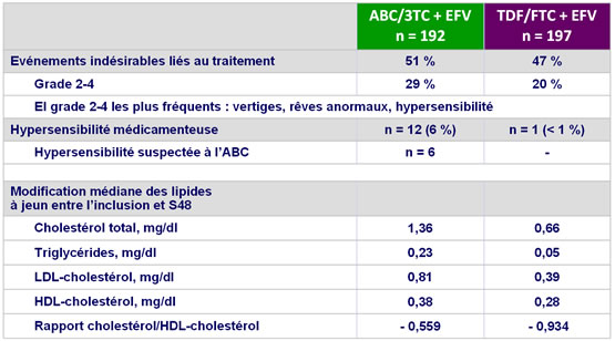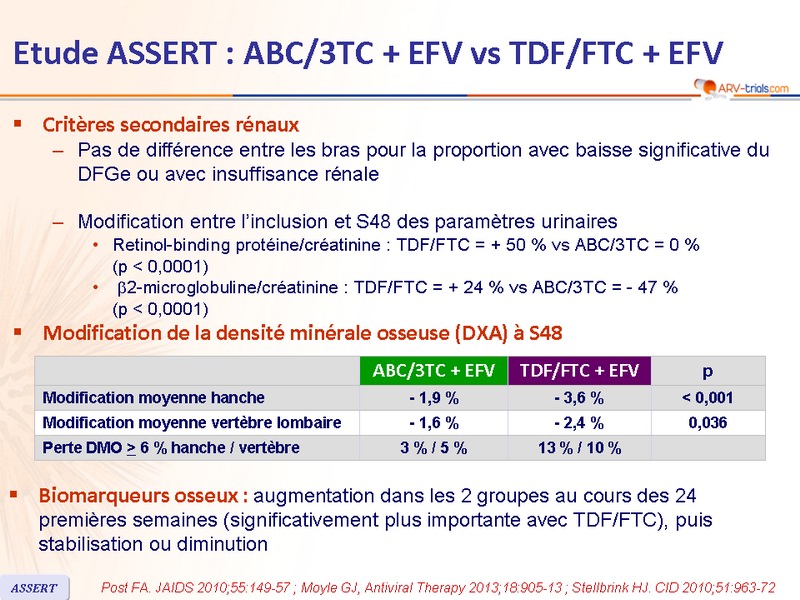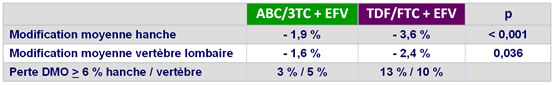 - Augmentation plus importante du turnover osseux et de la diminution de la densité minérale osseuse vertébrale et de la hanche sous TDF/FTC + EFV comparativement à ABC/3TC + EFV