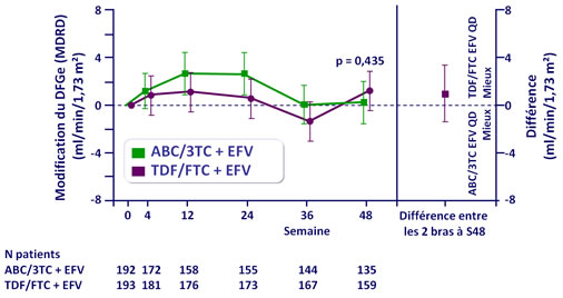 - Pas de différence dans la modification du débit de filtration glomérulaire estimé entre ABC/3TC + EFV et TDF/FTC + EFV