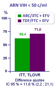 - Efficacité virologique significativement plus élevée pour TDF/FTC + EFV